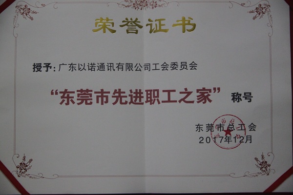 2018年1月12日,東莞市總工會(huì)向福日電子二級(jí)控股子公司廣東以諾通訊有限公司工會(huì)頒發(fā)“東莞市先進(jìn)職工之家”稱號(hào)的證書及牌匾。以諾通訊工會(huì)充分發(fā)揮橋梁紐帶作用,團(tuán)結(jié)凝聚廣大職工,推進(jìn)企業(yè)發(fā)展。圓滿完成了工會(huì)換屆選舉,定期召開工會(huì)會(huì)員代表座談會(huì),先后組織開展了《工會(huì)法》《勞動(dòng)法》《勞動(dòng)合同法》等法律法規(guī)講座,協(xié)辦東莞市大朗鎮(zhèn)首屆“迎新杯”企業(yè)足球賽等文體活動(dòng),作為基層工會(huì)優(yōu)秀代表,應(yīng)邀參加了2018年?yáng)|莞市困難職工幫扶工作座談會(huì)并作典型發(fā)言。