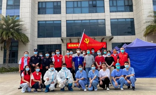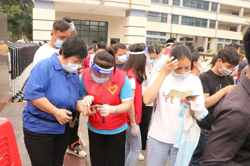 從早上8點半起,周邊企業(yè)的員工們就分批來到等待區(qū)域?!罢埻@里走?!薄奥闊┏鍪疽幌滦谐檀a?!币荒ò咨c紅色交織的身影,正在進行現(xiàn)場分流引導(dǎo)、幫忙查詢行程,他們正是由邁銳光電黨支部黨員和入黨積極分子組成的7人志愿者隊伍。在他們的助力下,現(xiàn)場每個步驟環(huán)環(huán)相扣、有條不紊,在當(dāng)日16時即完成全部6500余人的核酸檢測工作,讓黨旗在防疫一線高高飄揚。